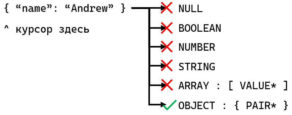 Як безлексерний парсер намагається парсити правила по черзі