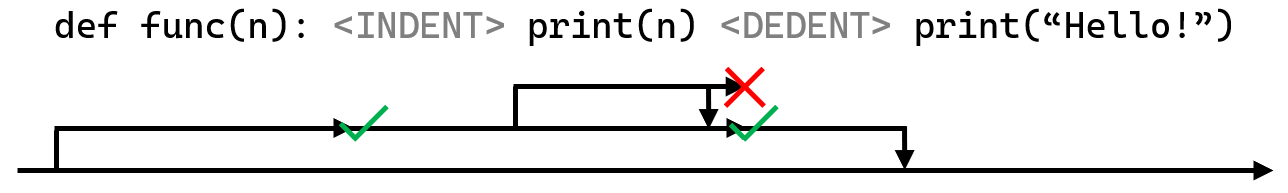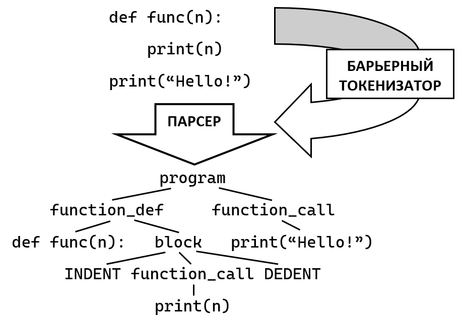 йому заважає бар'єрний токен DEDENT, тому він повертає лише одну захоплену інструкцію. Потім парсер успішно закриває блок токеном DEDENT і закінчує парсити функцію, потім проходить по решті інструкцій в програмі.