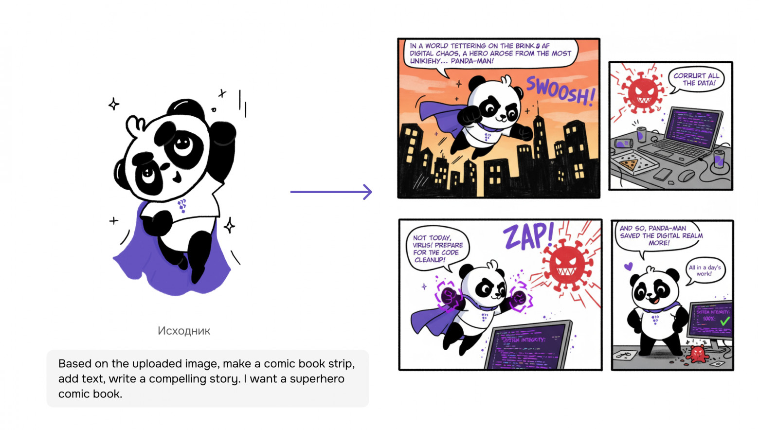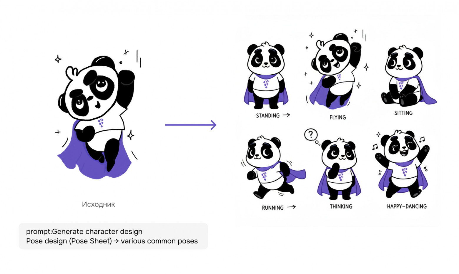 - Консистентність персонажів і предметів. Можна зробити серію кадрів з одним і тим же героєм в різних локаціях і костюмах — він залишається собою. Це порятунок для креативів, туторіалів, сторіс-серій і вітрин.