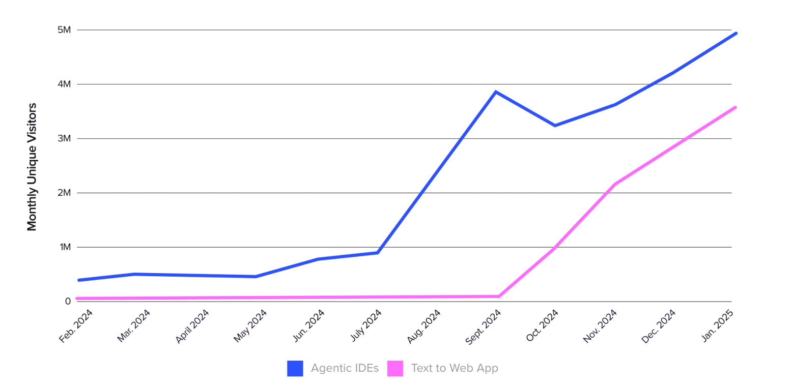 Він про найпростіші додатки для користувачів, які хочуть швидко створити щось робоче. Так, генеративні IDE все ще на першому місці — ними користується більше людей. Але росте популярність Bolt, Lovable, всяких no-code- або text-to-app-інтерфейсів: