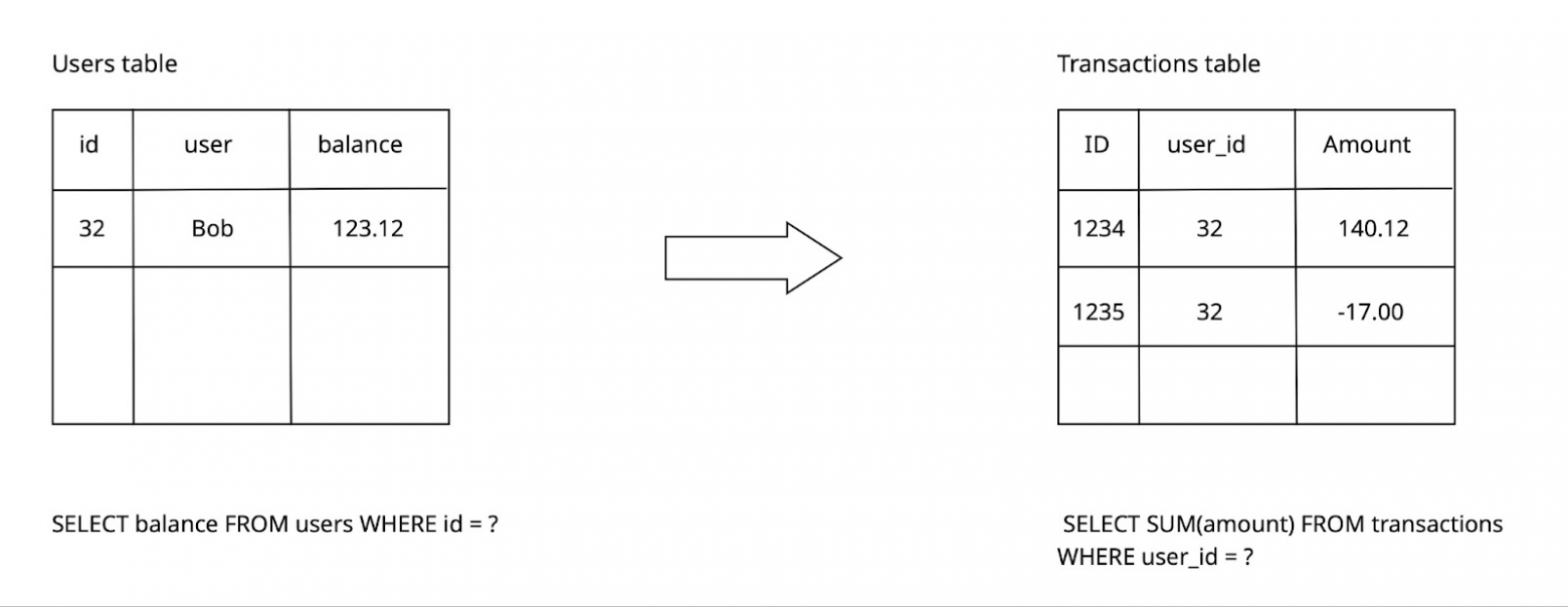 На правій частині, таблиця transactions містить тільки події зміни: поповнення та зняття коштів. Сума цих подій є актуальним балансом.