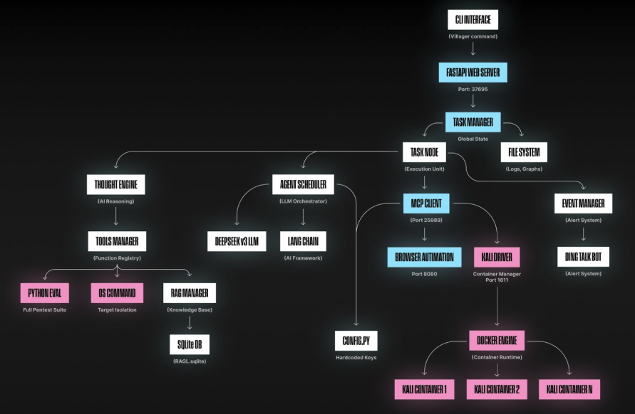 Сам Villager включає кілька компонентів для пентестингу — або атаки на чужу систему, залежно від того, хто використовує фреймворк ШІ. Він застосовує клієнтську службу MCP (порт 25989) для централізованої передачі повідомлень і координації, а також базу даних з 4201 системним запитом ШІ для генерації експлойтів і прийняття рішень у режимі реального часу. Villager автоматично створює ізольовані контейнери Kali Linux для сканування мережі, оцінки вразливостей і пентестингу.